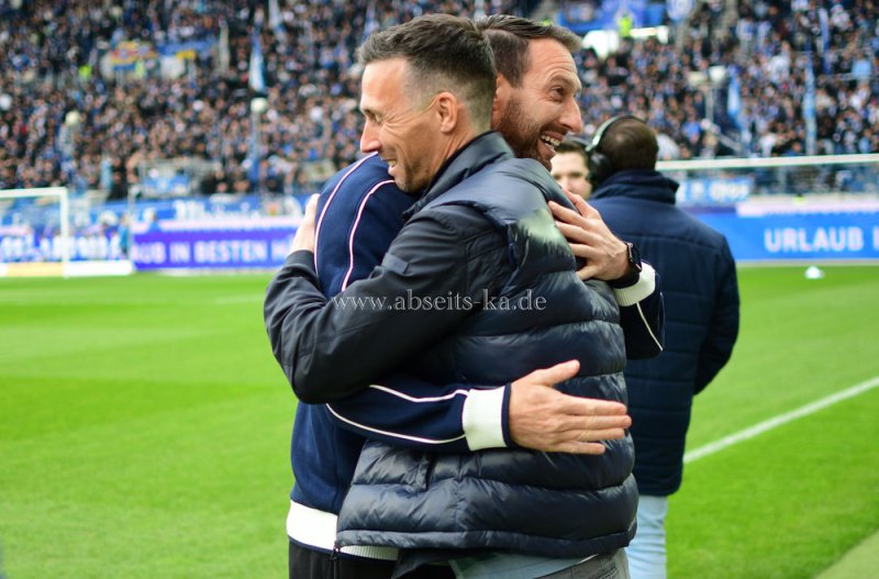 Karlsruhe (mia). Nach dem 3:1 durch Marvin Wanitzek rannte die Mannschaft zu KSC-Trainer Christian Eichner und feierte mit ihm, der am Saisonende gehen soll, das dritte Tor gegen Arminia Bielefeld. Am Ende siegte der KSC mit 4:1.