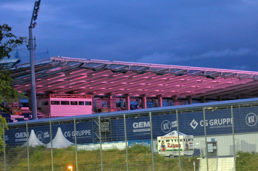 Karlsruhe (mia). Die Bauarbeiten im Wildparkstadion beim Karlsruher SC schreiten weiter voran. Die neue KSC-Gegentribüne hat mittlerweile ihr Dach und dieses erstrahlte durch die LED-Banden in verschiedenen Farben. Impressionen davon gibt es in folgender Galerie.