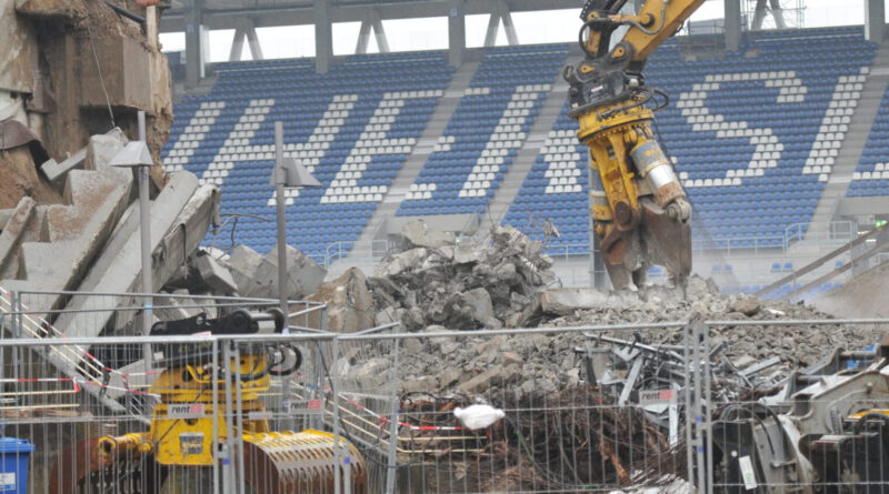 Bei der alten Haupttribüne sieht man an den Seiten bereits die Fortschritte der Abrissarbeiten. Im Innenbereich wird weiter entkernt und wie man in der Bildergalerie sieht, die Rohstoffe auch getrennt sortiert.
